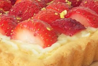 8. Etaler la crème patissière sur le sablé. Décorer de fraises préalablement rincées, équettées et coupées en deux.