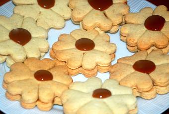 Ce petit sablé en forme de fleur sera meilleur le lendemain ,il simprégneras du mélange confiture de lait et du pralin ,un délice garantie