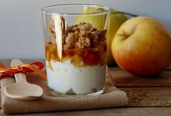 Montage : répartissez 2 pot de yaourt grec (340gr au total) dans 4 verrines. Dressez les pommes caramélisées puis le crumble. Servez immédiatement.