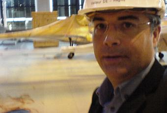 Patrice Girod en visite de chantier de Star Wars l’Expo à la Cité des Sciences de Paris, en 2005.En arrière plan l’installation du Chasseur Naboo. Photo © Patrice Girod