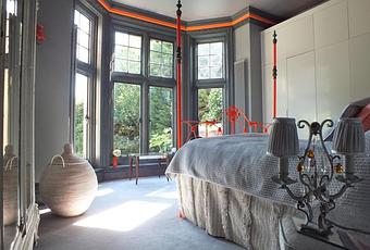 Voilà une maison atypique comme je les aime ! Ce manoir Victorien situé dans le sud de l'Angleterre, plus exactement dans le Berkshire, a comme des faux airs de château hanté de luxe. Un château, hanté non pas de fantômes, mais de trésors ! Un château hanté qui ne fait pas peur, mais plutôt qui intrigue, qui capte votre attention et embarque votre imaginaire très très loin. Un de ceux qu'on imagine remplit de cachettes secrètes où l'on voudrait bien se perdre quelques heures afin d'y dénicher quelques merveilles. Ici, des merveilles il y en a : hauts plafonds, grandes ouvertures sur l'extérieur, couleurs chaudes et même sombres , matériaux nobles et bibelots baroques sont ravivés par des touches d'orange fluo et de rouge vif qui rendent l'espace particulièrement vivant et chaleureux. Une atmosphère euphorisante chargée de passion. Je m'enflamme ! Et puis vient le jardin, immense et bucolique. On revient alors dans la fraicheur et la douceur d'un jardin anglais, comme pour aider nos yeux et nos esprits à se remettre de cette rencontre palpitante...