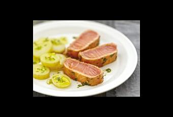 La veille, coupez le morceau de filet de saumon en deux dans la longueur, assaisonnez-les. Faites-les saisir 20 secondes de chaque côté dans une poêle dans 5 cl d’huile d’olive. Laissez-les refroidir sur un papier absorbant. Réservez 2 branches de coriandre pour les pommes de terre, hachez le reste, mélangez-la avec la sauce soja dans un bol.