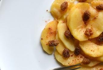 J'ai choisi de saupoudrer cette poudre magique sur des pommes caramélisées et fondantes, associées aux mulberries séchées (qui sont des baies de la famille des mûres) elles aussi riches en vitamines. Vous pouvez bien sûr remplacer les mulberries (très onéreuses malheureusement) par d'autres baies (comme les cranberries) ou autres fruits secs (raisins, figues, abricots...).