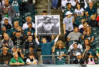 Parlant de McNabb, il n’a pas toujours été le commentateur amer en manque d’attention qu’il est devenu. A ses débuts, il fut un excellent pivot, capable de se sortir des situations les plus périlleuses. Le jeu le plus marquant sous son règne demeure toutefois cette conversion désespérée d’un 4e essai et 26, contre les Packers en séries. Dites seulement « 4th and 26 » à Philadelphie et la cassette part. Ce jeu fait partie de la petite histoire de la ville maintenant. Voici également un hommage à McNabb, suivi de, parce que les partisans des Eagles n’ont pas la réputation qu’ils ont pour rien, les huées senties qui avaient marqué sa sélection au repêchage.