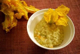 Cela fait quelques temps que nous n’avons pas posté de recette de risotto et pourtant c’est un des plats préférés des cookers THCF. Je remédie donc à cette période de disette en vous présentant un risotto à la fleur de courge et fontina. Ce risotto a un goût puissant, je vous le conseille donc en entrée. Vous pouvez remplacer la fontina pas n’importe quel autre fromage du même genre, je pense entre autre au Puzzone di Moena dont je vous ai déjà parlé. Je ne détaillerai pas en détails la préparation de ce risotto, si vous avez besoin de plus de précisions je vous conseille de lire cet ancien poste. Dans cette recette je ne mets pas de beurre, il est remplacé pas la fontina qui devient très crémeuse à la chaleur.
