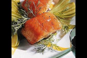 - Au terme de la cuisson, la peau se trouvant contre la poêle doit être grillée et le dessus juste tiède et encore translucide. Déposer ces pavés de saumon sur des assiettes. Parsemer de gros sel et de poivre concassé puis entourer des courgettes en éventails. Arroser du reste d'huile d'olive et parsemer d'aneth.