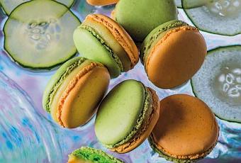 "Huile d’olive à la mandarine et eau de concombre. Deux parfums que Pierre Hermé vient jumeler avec délicatesse dans un macaron, comme une réinterprétation de la note marine empruntée au répertoire de la parfumerie. Ni tout à fait la sensation de l’agrume, ni tout à fait celle du concombre. Un goût. Ou l’étonnante senteur iodée d’un jardin merveilleux." site officiel