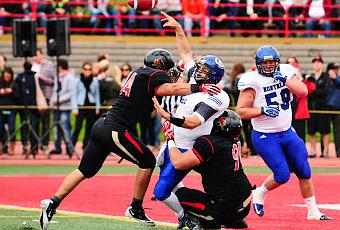 Que dire de la performance de notre ligne à l’attaque? Nous étions tous anxieux de voir comment cette dernière se comporterait face au front défensif des Carabins. Cette anxiété s’est amplifiée lorsque sur leur première présence, ils se sont faits surprendre en négligeant de bloquer un demi défensif adverse qui s’est très rapidement rendu à T. Grenon pour un sac. D’ailleurs, chacune de nos quatre premières séries à l’attaque s’est soldée par un sac. Le match s’annonçait très long pour nos gros bonhommes jusqu’à ce que les ajustements se fassent. Dès lors, la bataille fut à l’avantage de notre ligne à l’attaque et ce, jusqu’à la fin du match. À preuve, à partir du début du 2ième quart, aucun autre sac n’a été enregistré par les Carabins. De plus, notre attaque au sol a généré 205 v. G. Bourassa était dans sa zone. Il a été le meilleur des nôtres en produisant 107 v. sur 13 portées en plus de capter une passe pour un premier jeu.