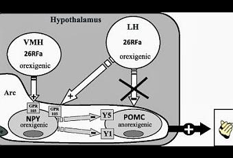 Mécanisme d'action proposé du 26RFa dans le contrôle hypothalamique de la prise alimentaire. Le 26RFa produit par les noyaux de l'hypothalamus ventromédian (VMH) et de la zone hypothalamique latérale stimulent les neurones à Neuropeptide Y du noyau arqué (Arc) par l'activation du GPR 103. Le relâchement de NPY dans le noyau arqué qui en résulte inhibe à son tour l'activité des neurones à préopiomélanocortine (POMC) par l'inhibition des récepteurs Y1 et Y5, menant à la stimulation de l'appétit. In Frontiers in Neuroendocrinology Volume 32, Issue 4, October 2011, Pages 387 - 397*