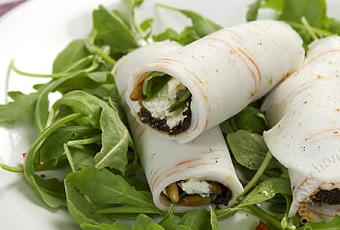 Servir 3 rouleaux de jambon de la mer par personne sur un lit de roquette vinaigrée.