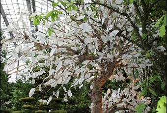 »L’Arbre Féerique », cet objet unique composé d’un tronc de théier avec des feuilles en porcelaine blanche est la résultante des talents de la céramiste Barbara Billoud et du sculpteur végétal Geneviève Mathieu. »
