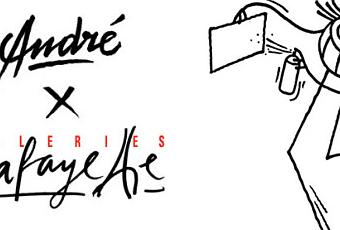 Hier soir à 20h, le magasin des Galeries Lafayette Haussmann, a organisé une performance d’André rythmée par un concert live des CITIZENS à l’occasion de la Fashion Week. Un graff live accroché dans le vide sur l’affiche « Mode in Love » de Jean-Paul Goude.