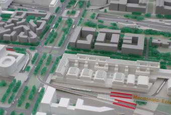 Patatras ! Sur cette maquette, ci-dessus photographiée, on remarque que le T8 est prolongé sur la Petite Ceinture suivant une hypothèse admise par Réseau ferré de France, propriétaire de la ligne, dans sa déclaration de projet du 14 février 2011 sur la création de la gare Rosa Parks). Totalement incompatible avec les projets de la Retraitée-Dauphine, pourtant en charge du dossier à la ville !