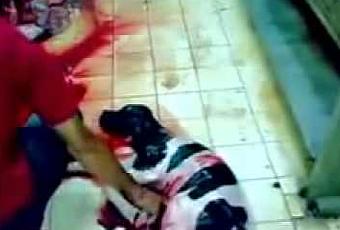 Vache enceinte égorgée et éventrée vivante dans un abattoir hallal ou casher..