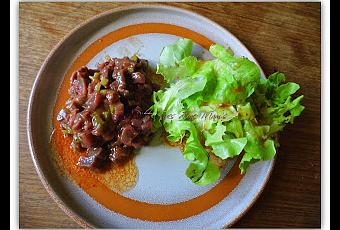 Coupez votre viandes en petits cubes.Emincez l'échalote et les cornichons.Mélangez et ajoutez le jaune d'oeuf, le ketchup, les câpres, le sel et le poivre.Servez accompagné d'une salade verte, c'est juste excellent!!!!!