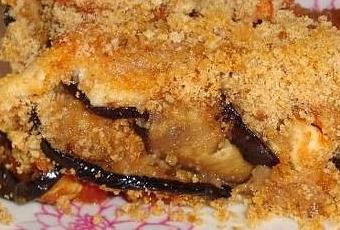 terminer par de la sauce tomate et recouvrir du mélange parmesan/chapelure, secouez un peu et parsemez de quelques copeaux de beurre,