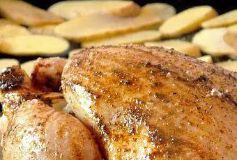 N'hésitez pas à arroser les pommes de terre avec la graisse et la marinade qui s'écoule du poulet. Vous pouvez aussi badigeonnez le poulet une nouvelle fois avec la marinade restante.