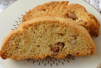Commencer par couper les amandes en tronçons (voir photo) ou les hacher grossièrement : attention ne surtout pas mettre les amandes entières car en coupant les biscuits en tranche ils vont s'effriter.