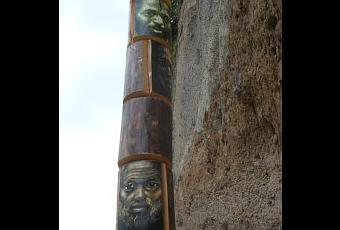 La forme et les couleurs de ces troncs en mahogany plantés dans le sol renvoient le visiteur ou le voyageur à ces immenses totems de l’Amérique du nord, objets rituels nous a–t-on expliqué des tribus amérindiennes servant de blason, et sculptés et peints des emblèmes d’une famille. Le mot d’origine étant ‘odoodeman’ signifiant ’sa famille, son clan’ ou blason de la famille en langue ojibwés, nous confirment encore nos recherches. Ici, pas d’oiseaux mythiques, ou de tête d’ours ou encore de baleine sur les totems de Claude Cauquil, mais des visages de différents types comme ceux de la fresque murale du Rond-Point de Bellevue à Fort-de-France, créée en 2009 et intitulée Les Hommes en Marche.