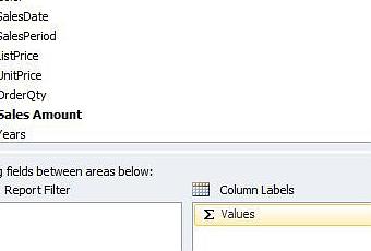 Dans l’exemple suivant, j’ai d’abord inséré les champs régions (Region) et marchés (Market) dans les étiquettes de lignes du tableau croisé dynamique. Ensuite, j’ai ajouté le champs ventes (Sales Amount) dans la zone des valeurs du tableau croisé dynamique. Finalement, j’ai ajouté une deuxième fois le champs ventes (Sales Amount) dans la zone des valeurs et je l’ai simplement renommé Somme des ventes (Sum of sales amount).