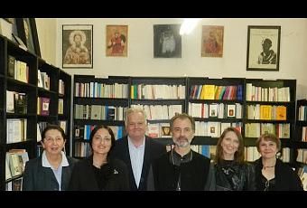 La librairie parisienne des éditions L'Age d'Homme était pleine samedi dernier pour la rencontre avec Nana Peradze et la présentation du disque Eucharistia de l'ensemble Harmonie géorgienne, aux éditions Jade. Beaucoup d'écoute et d'intérêt. Avec Zorica Terzic de L'Age d'Homme, nous avons présenté le parcours artistique, notamment musical, de Nana Peradze qui a aussi répondu à mes questions. Des extraits ont été diffusés.Ci-dessous, après la présentation, dans la librairie, de gauche à droite, avec moi: Colette Chamboredon, directrice des éditions Jade, Nana Peradze, chef de chœur et compositrice, Emmanuel Chamboredon, président de la maison de disques américaine Milan Records, Irina Kotova, artiste biélorusse, Zorica Terzic de L'Age d'Homme, traductrice.