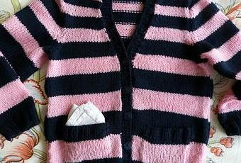 Montage et encolure : repasser légèrement à la pattemouille tous les morceaux et les laisser sécher, fixer les fonds de poches à l’envers des devants à points coulés en utilisant des fils de la même couleur pour rendre les coutures invisibles. Coudre les devants au dos et aplatir la couture d’épaule au fer. Monter les manches à plat sur l’endroit au point de surjet maille à maille, en utilisant deux aiguillées : une bleue et une rose. Bien faire correspondre les rayures. Relever avec les aiguilles n°2,5 le long de l’encolure un maximum de mailles (176) et tricoter un rang endroit sur l’endroit ou envers sur l’envers puis 6 rangs de côtes 2/2, rabattre en une fois. Ménager les boutonnières sur le côté droit : tricoter 4 mailles puis 2 mailles ensemble, puis 8 mailles et ainsi de suite, remonter la maille au rang suivant en faisant un jeté. 5 boutonnières.