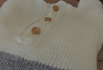 La petite rentre bien dans le pull mais il nous faut une grue pour pouvoir l’enlever tellement elle est serrée. Déception, cris, pleurs, résignation. Ma petite pupuce ne portera jamais ce petit pull tricoté avec amour. Il ne me reste plus qu’à trouver une choupette qui pourrait en profiter.