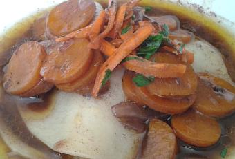 Vous pouvez servir cette daube avec du riz ou bien des pâtes, ici c’était une raviole maison farcie à la daube. Et il suffit de déposer les petits morceaux de carottes rappée sur le dessus.