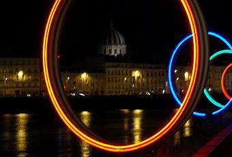 Nantes le quai des Antilles sur les bords de la Loire , les anneaux de Buren et Bouchain le soir , vue sur Notre Dame de Bon Port aussi nommée Saint Louis