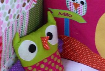 La demande de Carole concernait la naissance de son troisième enfant, un garçon, qui a depuis été accueilli par son grand frère et sa grande soeur... Aînés, mais pas si grands que ça, puisque leur maman les appelle "ma pucette" (Lou, 3 ans) et "mon p'tit bouchon" (Nil) ! Les trois petits bouts occupent ensemble une grande chambre, d'où une déco variable selon les espaces de chacun : le challenge que me proposait Carole était donc de lui proposer un ensemble personnalisé comprenant deux gigoteuses, un tour de lit et une housse de matelas à langer, mais dont les coloris et le thème allait s'insérer naturellement dans la déco déjà en place.