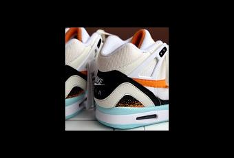 Les Nike Air Tech Challenge II White-Kumquat a un upper en cuir perforé blanc et cuir beige contrastés par des touches de noir, d’orange, et de bleu clair.