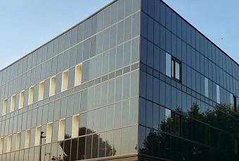 Un Immeuble de bureaux contemporain basse consommation utilisant la technologie des panneaux solaires pour produire une énergie renouvelable, propre, et contribuant ainsi au développement durable.