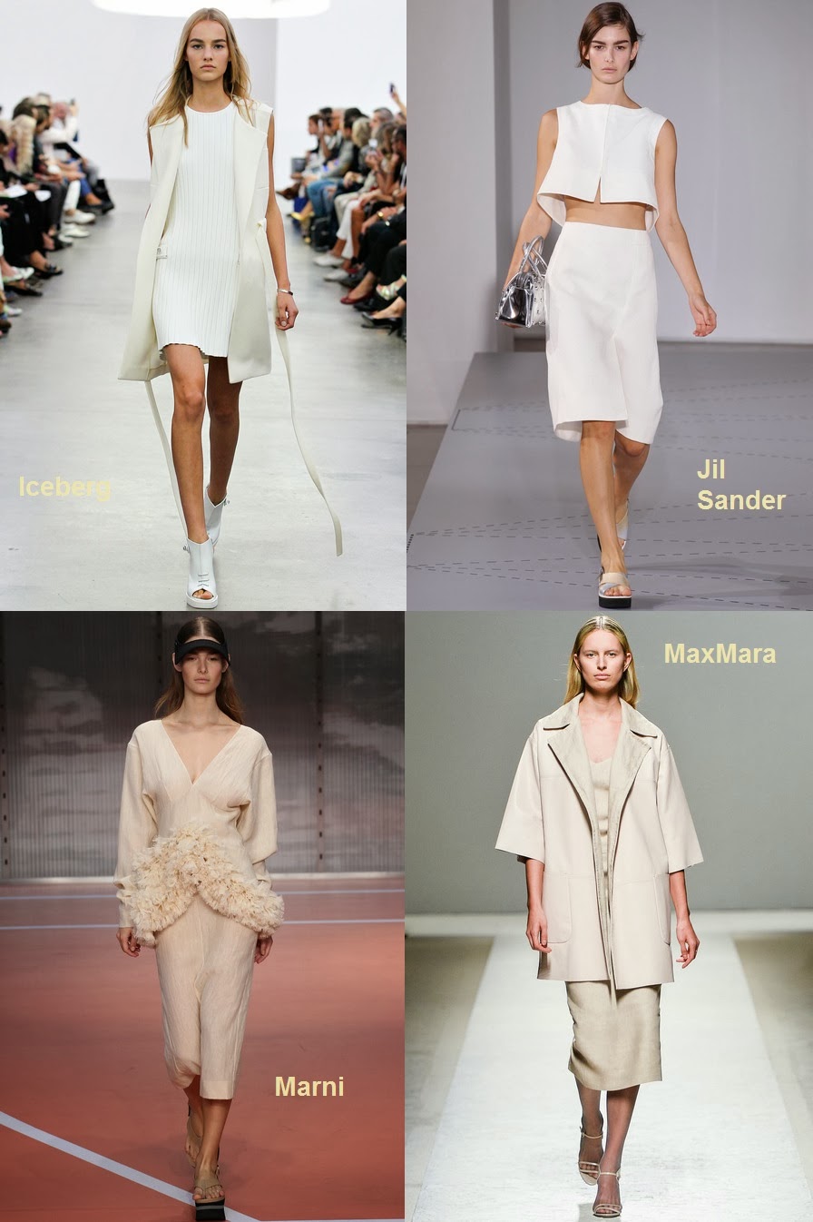Les italiens ne sont pas que théâtralité et exubérance, ils proposent aussi de très belles silhouettes minimalistes dans les teintes beiges et blanches: attention tout de même au teint maladif...