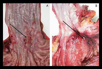 A. Adénocarcinome du tiers inférieur de l'oesophage, développé sur endo-brachy-oesophage après chimiothérapie néo-adjuvante. Il persiste cette ulcération de 3 cm grand axe. Après inclusion en totalité de cette ulcération, seuls quelques amas adénocarcinomateux ont été mis en évidence. B. Adénocarcinome du cardia mesurant 4,5 cm après chimiothérapie néo-adjuvante. Une dizaine de prélèvements ont été réalisés sur cette lésion. La réponse tumorale histologique était minime. In Annales de Pathologie, Volume 31, Issue 6, December 2011, Pages 419 - 426