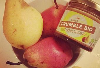 Pour un dessert gourmand mais pas compliqué je vous propose d’acheter quelques poires (j’ai pris plusieurs variétés) et d’utiliser la préparation Bio crumble poire – crème de marron d’Instant Naturel. Vous trouverez ces produits chez Casino et Carrefour Planet. L’idée : en rajoutant quelques fruits, vous préparez un dessert frais et gourmand.