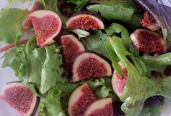 Mettre la salade dans une assiette, y ajouter les figues coupées en tranche.