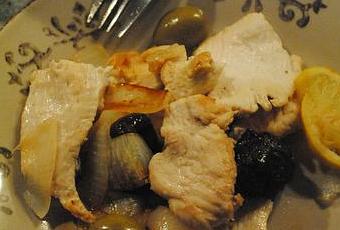 When the chicken is half cooked, add the olives, lemon, prunes and laurel.