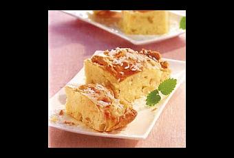 - Beurrer un moule de 20 cm de diamètre et y mettre la pâte. Cuire au four environ 30 mn. Saupoudrer de noix de coco râpée.