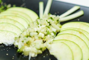 - Dans un bol, mélanger les dés de fenouil, la coriandre ciselée (mais il faut en garder un peu pour la déco) et le sirop de badiane.