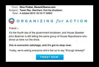 Le dernier mail que j’ai reçu de l'équipe de BarackObama.com, le 4 octobre, dit explicitement qu’au quatrième jour du shutdown, il faut que tous disent aux républicains que c’en est assez maintenant ("enough already"), qu’on les submerge de tweets leur rappelant que le job du Congres est de financer le gouvernement, qu’ils l’empêchent de payer ses factures, qu’ils sont responsables du shutdown et qu’ils "sabotent l’économie" — rien que ça ! ….