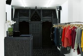 un confessionnal du 19ème en chêne noir où l’essayage des vêtements devient une expérience décalée de recherche de sens et d’implication sociétale
