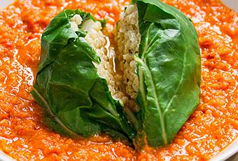 - Envelopper chaque boulette de risotto d’orge avec une feuilles de blette puis les déposer dans un plat allant au four avec un fond de bouillon de légumes.