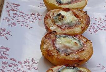 Vous pouvez servir ces pêches en entrée avec une salade verte, des pignons de pin et des croûtons grillés à l'huile d'olive.