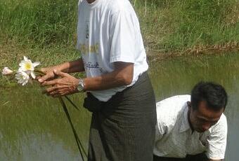 Avec le chauffeur du tuk-tuk, ils sont mis à la recherche de fleurs de lotus blanche, bleue et rouge pour leur vertue médicinale. Ils descendent du tuk-tuk, mettent les pieds à l’eau plusieurs fois, cueillent des fleurs.
