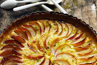 Tarte entre pomme et flanIngrédients : 2 ou 3 petites pommes bien acidulées – 1pâte brisée – 2càs d'amandes effilées – 2 œufs – 90g de crème liquide entière – 4càs de sucre en poudre – le zeste d'1/4 de citronEtalez le rouleau de pâte et saupoudrez-le avec les amandes. Donnez un coup de rouleau sur la pâte pour y incruster les amandes.Tapissez un moule à tarte avec la pâte puis faites la précuire au four. Faites-la d'abord précuire couverte pendant 8 minutes, personnellement j'utilise du papier sulfurisé que je remplis de farine, mais vous pouvez aussi utiliser des haricots ou des poids de cuisson, puis enlevez le papier sulfurisé et poursuivez 4 minutes.Pendant ce temps coupez les pommes en fins quartiers en enlevant bien sûr le cœur des pommes. Mélangez dans un saladier les œufs, la crème liquide, le sucre en poudre et le zeste de citron. Versez cette crème sur le fond de tarte puis rangez les pommes.Enfournez pour 30 à 35 minutes dans un four préchauffé à 180°.Laissez refroidir et si comme moi vous avez un peu de pistaches en poudre qui trainent par là…Mais pourquoi, bon cela dit l'huile c'est bien aussi non... non ??? est-ce que je vous raconte ça...
