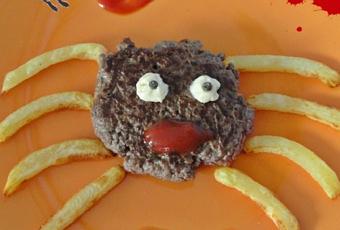 Faire des frites.Donner une forme de boule un peu aplatie au steack haché et faire cuire à la poêle.Mettre le steack haché au milieu d'une assiette et 4 frites de chaque côté pour faire les pattes.Pour les yeux : mettre 2 gouttes de mayonnaise et enfoncer 2 grains de poivre vert au milieu.Pour la bouche : mettre une ligne de ketchup.Et voilà !Bien évidemment, 8 frites ce n'est pas assez pour se faire plaisir ... mettre une portion dans une coupelle à disposition pour compléter l'assiette.