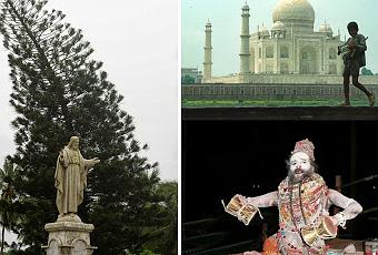 Tout d’abord, observez comme cette statue de Jésus a été capable de courber cet arbre. Aucun truquage. La photo est représentative de la réalité. Elle a été prise à Old Goa, cette cité construite en leur temps par les Espagnols, quand Goa était un de leurs comptoirs.Avez déjà rencontré chez nous une telle prouesse ? En Inde, même les végétaux s’inclinent devant la puissance divine. Peut-être que prochainement, cet arbre fera une génuflexion complète…Regardez ensuite cet enfant qui marche devant le Taj Mahal, la merveilleuse sépulture faite de marbre blanc. Voyez comme il est grand, et comme sa silhouette, loin d’être écrasée par l’immensité de l’arrière-plan, domine le monument.En Inde, les enfants savent se jouer de la mort. La vie leur est suffisamment âpre et difficile, pour qu’ils sentent grandis devant elle…