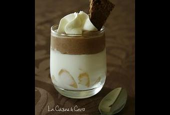 4. Pour la mousse chocolat : Faire fondre le chocolat avec le lait au micro-ondes. Monter les crème en chantilly puis y incorporer le chocolat fondu, et tiédi. Verser sur la mousse de poires.