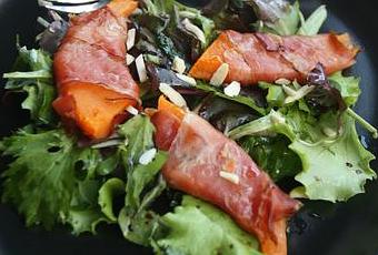 Ingrédients pour 4 personnes : 200gr de mesclun (ou autre type de mélange) lavé et essoré, 12 tranches de courge (pas trop épaisses), 6 tranches de speck, 4 c. à soupe d'huile d'olive vierge extra, 1 c. à soupe de jus de citron, une poignée d'amandes grossièrement hachées, sel et poivre.