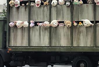 Le mois spécial BANSY continu dans les rues de New York, après ce camion transformé en paysage enchanté, voici le camion The Sirens of the Lambs. Des peluches animées façon bétail. « A slaughterhouse delivery truck touring the meatpacking district and then citywide for the next two weeks. »